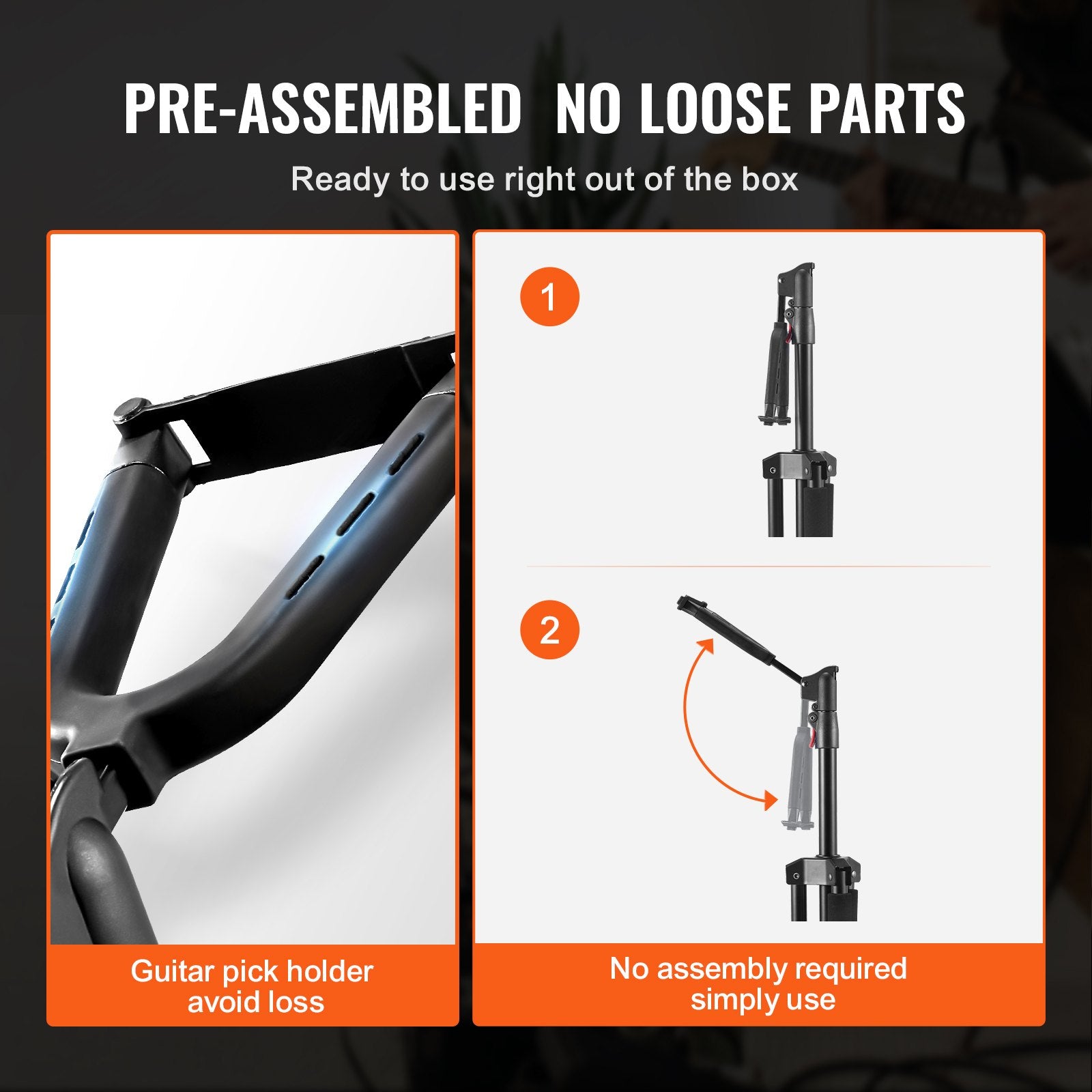 No installation parts needed-this fully assembled guitar stand is ready to use straight out of the box. Designed with a convenient guitar pick holder and high-density foam padding at all contact points, it ensures your guitar remains scratch-free. Experience thoughtful, user-friendly design in every detail.